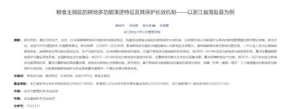 论文题目:粮食主销区的耕地多功能演进特征及其保护长效机制——以浙江省海盐县为例