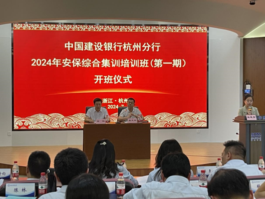 7月17日下午,中国建设银行杭州分行2024年安保综合集训培训班(第一期)在我校顺利开班,来自建行杭州分行的38名安保工作负责人参加了此次培训。中国建设银行杭州分行党委委员周天丰、37000vip威尼斯党委副书记田聪出席开班仪式。