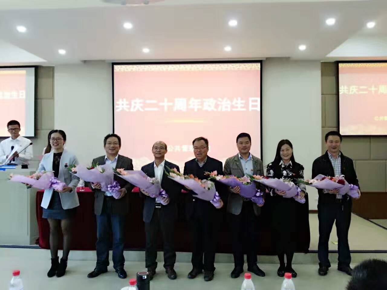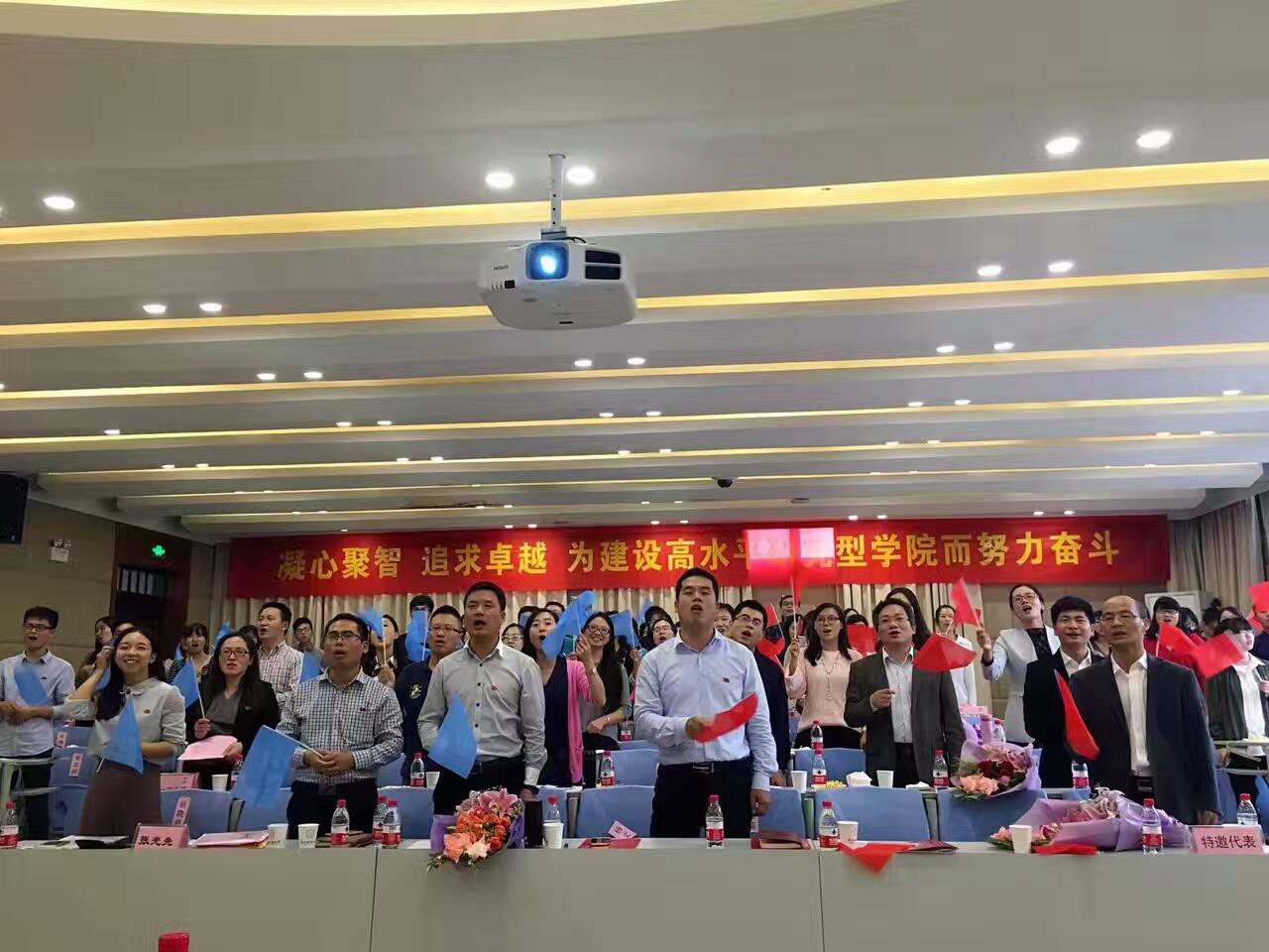 在选举计票环节,大会进行了党员固定活动日活动。在全体师生党员重温完庄严而又神圣的入党誓词后,学生党员为20年党龄教工党员献上鲜花,大家一起为老党员庆祝入党20周年政治生日,向老党员们致敬。在随后的红歌传唱环节,全体党员分成红蓝两队,分别在两名党员的领唱下激情放歌,现场旗帜飞舞、气氛热烈,全体党员不仅感受了经久不衰的红歌魅力,更经历了一次思想的洗礼。