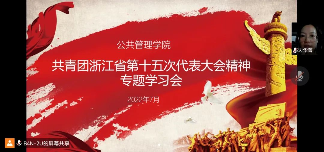 7月22日上午,中国共产主义青年团浙江省第十五次代表大会在杭州开幕。袁家军书记强调,习近平总书记关于青年工作的重要思想为我们在新历史起点上推动共青团事业守正创新、促进青年一代成长发展指明了前进方向、提供了根本遵循。为积极响应大会向全省团员青年发出的“高举旗帜跟党走牢记嘱托当先锋,在奋力推进‘两个先行’中唱响‘我在窗口写青春’最强音”号召,37000vip威尼斯青年师生组织开展共青团浙江省第十五次代表大会精神专题学习会。
