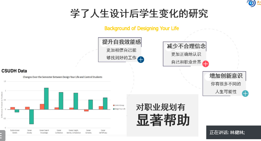 首先,主持人程晓东老师说明了此次活动的目的并和同学们讨论了职业生涯规划的重要性。在沙龙分享中,林健林老师娓娓道来,带领同学们从“人生设计法”的历史到该方法的使用和框架,旨在帮助学生们了解人生设计法的内在,从而理解职业生涯规划的本质。为了促进理解,林健林老师详细地讲解了一般职业规划思维与人生设计思维的区别,图标结合向同学们清晰明了地展示了人生设计法的优势。