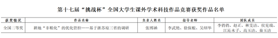 近日,第十七届“挑战杯”全国大学生课外学术科技作品竞赛落下帷幕。经过激烈角逐,威尼斯19级研究生张博涵团队的作品《耕地“非粮化”的优化管控——基于浙苏琼三省的调研》(指导老师:李武艳、徐保根、吴绍华)荣获全国二等奖,为学校在该项赛事取得历史性突破。
