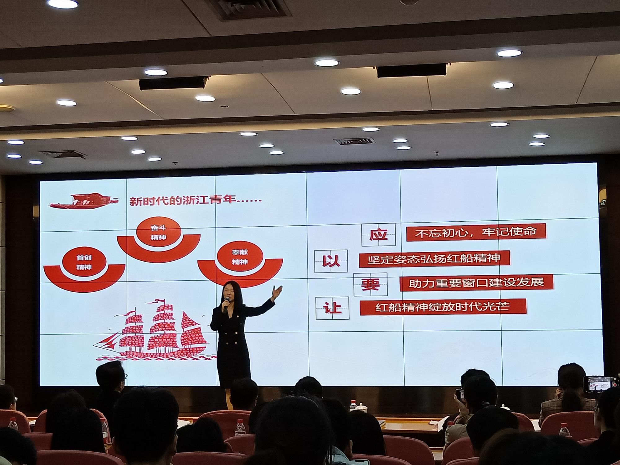 周衍彤老师以《弘扬红船精神,探索重要窗口奥秘》为题,倡导新时代的青年应不忘初心,牢记使命,以坚定姿态弘扬红船精神,助力重要窗口建设发展,让红船精神绽放时代光芒。