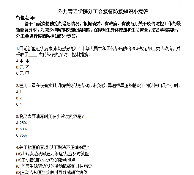 本次疫情防控知识竞赛通过网络平台发布,以问卷形式开展,涵盖了新冠肺炎的基础知识、学校防疫制度等方面内容。