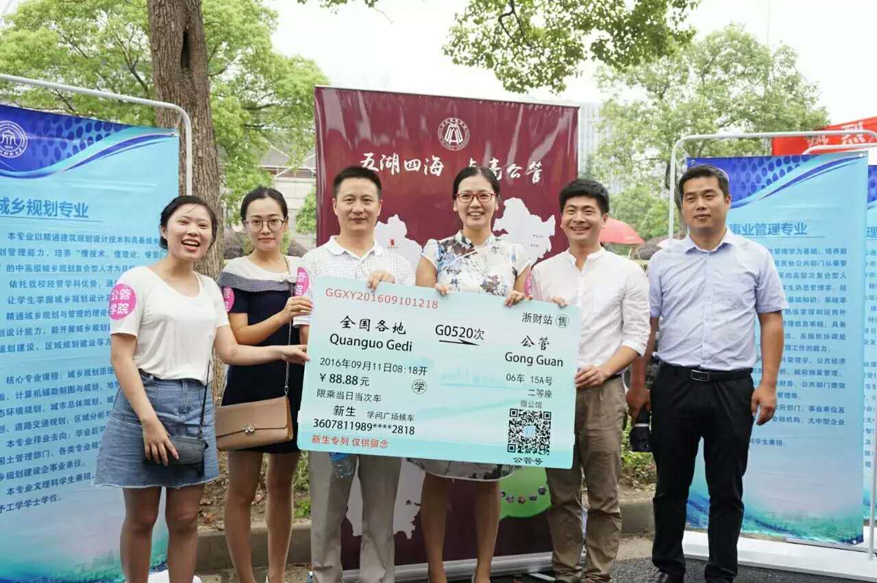 8时许,2016级新生接踵而来。在志愿者的引领下,新生和家属来到由新生各班班导为主要力量的报到处,注册登记后,新生们领着大礼包来到横幅前拍照留念,一张类似火车票的牌子,由“全国各地”驶向“公管”的公管号列车寓意十足。背景是一幅全国、全省地图,每一名报道的新生都会贴上一颗红色五角星,新生在全国各地的分布情况和报道情况尽收眼底,更加凸显出威尼斯新生“五湖四海”的特点。学院领导亲临现场慰问工作人员,并与新生一起合影留念,现场气氛热烈,拍立得的现拍效果更得到新生和家长们的一致喜爱。