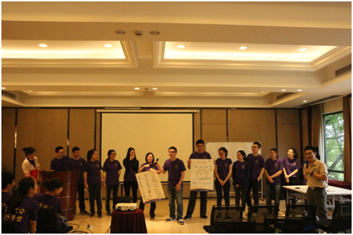 到达目的地后,在教练的安排下,70余名学生被分成5组,在短短的时间内,各队队员们竭尽全力发挥个人智慧,在规定的时间完成取队名、定队长、队蜜、队训、队歌、设计队徽并用独特的方式展示出来。“冲出亚马逊、驿站、极速60秒”等拓展项目,激发了新生勇于挑战、增强信心的意识,树立了相互配合,团队合作的精神,让这个比较陌生的大家庭成员之间互相有了一定的认识和了解,为接下来的2年左右的学习奠定了良好的基础。