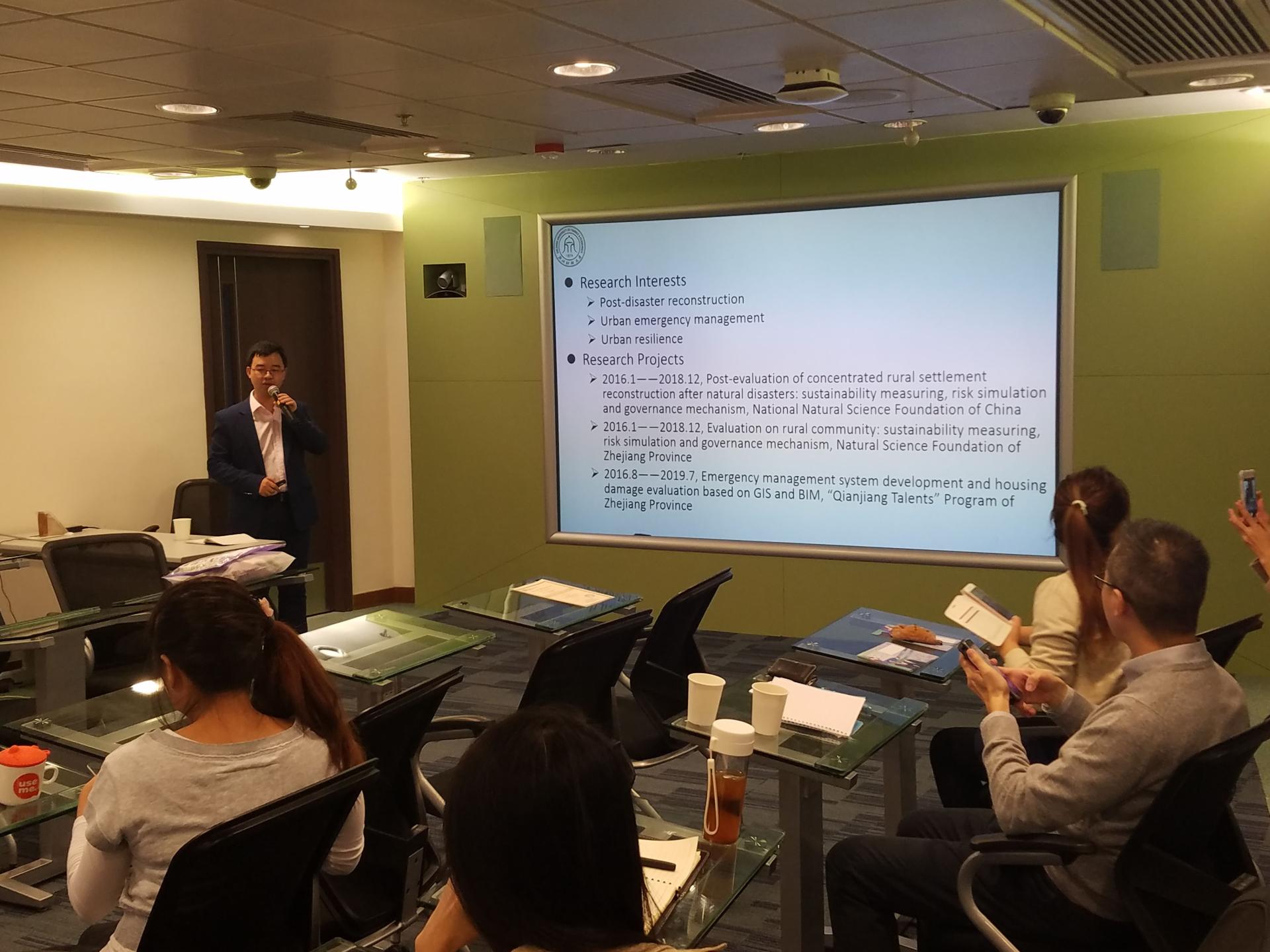12月7日,威尼斯工程管理系老师彭毅,受邀在香港理工大学建设及房地产学系访问,并作了题为 “What are learnt in concentrated rural settlement development after the 5.12 Sichuan Earthquake: Implications from both big and small data”的学术报告。彭毅老师结合国家自然科学基金资助课题的研究,分享了综合应用文本挖掘与问卷调查进行灾后重建研究的发现与心得体会。报告获得了师生们的一致认可,并进一步就文本挖掘、政府与社会在灾后重建中的角色等问题进行了热烈地讨论。