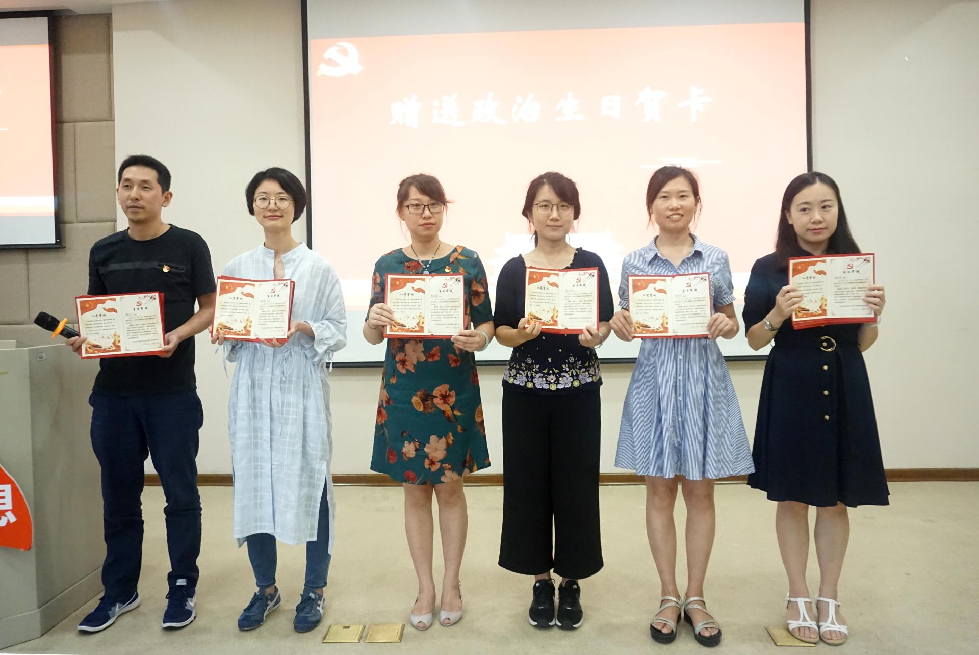 现场还举行了教工党支部书记向党员代表赠送政治生日贺卡仪式,各支部党员教师代表满怀着激动的心情依次发言表达入党初心。为传承老同志优良作风,由学生党员向党龄20年及以上的老党员献花,表达致敬。入党申请人卢怡老师还现场向党组织提交了入党申请书。党日活动在重温入党誓词中落下帷幕,全体教工党员表达不忘初心、牢记使命的庄严承诺。
