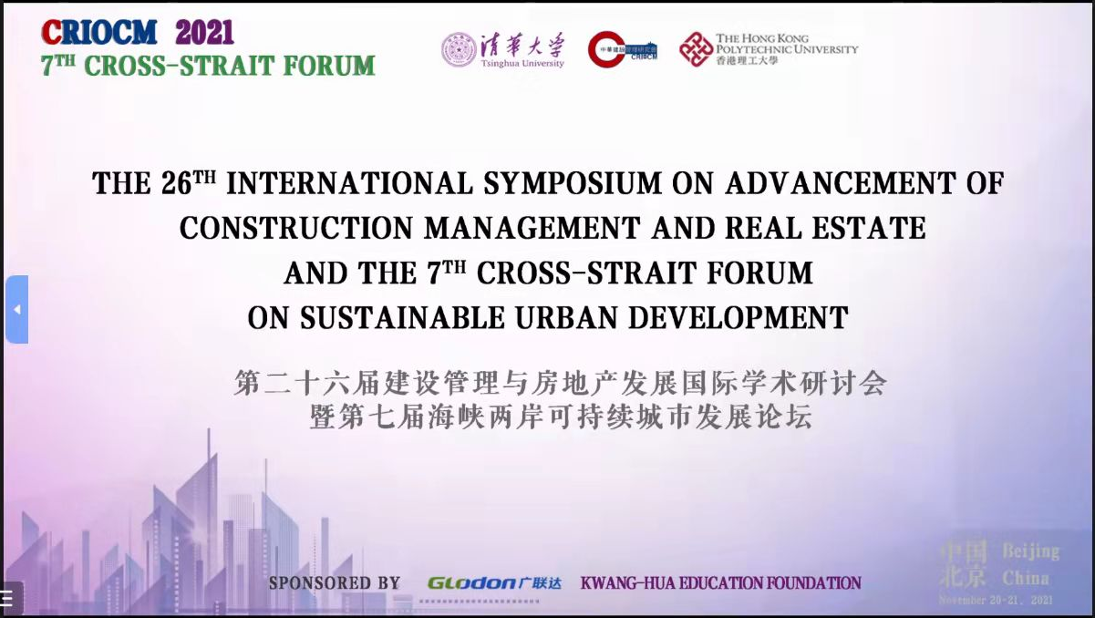 11月20日至11月21日,中华建设管理研究会(CRIOCM)与清华大学、香港理工大学联合主办的第二十六届建设管理与房地产发展国际学术研讨会(CRIOCM2021)暨第七届海峡两岸可持续城市发展论坛以线上会议的形式顺利举行,会议主题为“Innovation and Sustainability in Construction Management and Real Estate”。共有来自中国大陆、中国香港、英国、美国、澳大利亚、荷兰等地区两百多位学者参会研讨,五百多位观众收看研讨直播。威尼斯工程管理系彭毅、王鸿迪老师及研究生郑蓉蓉、章艺也、苏婕妤受邀出席了本次会议。
