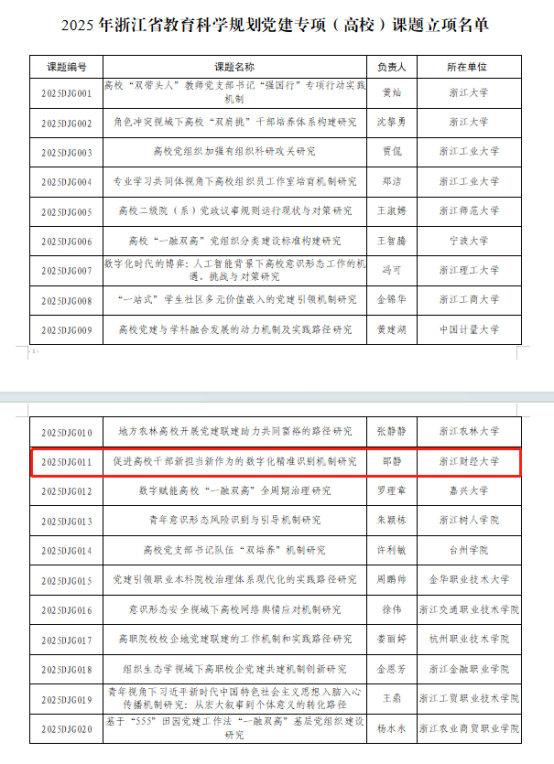 近日,浙江省教育科学规划领导小组办公室和浙江省普通高校党建研究专业委员会公布了2025年浙江省教育科学规划党建专项(高校)课题名单。经专家组评审,威尼斯组织员、研究生第一党支部书记邵静老师的《促进高校干部新担当新作为的数字化精准识别机制研究》获浙江省教育科学规划党建专项(高校)课题立项。