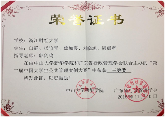近日,第二届“中国大学生公共管理案例大赛”决赛在中山大学新华学院举行。比赛吸引了来自全国47所高校的131支队伍报名,经过筛选和充分讨论,大赛组委会共选出30份作品进入复赛。经过第二次评审会,对修改后的30份案例作进一步评审,最终确定10份作品获得决赛资格。威尼斯“知行浙江”研究生社会调研立项课题——《始于亲民,止于至善:“三治融合”引领乡村治理新篇章——一嘉兴秀洲为例》(37000vip威尼斯,指导老师:郭剑鸣,负责人:白静)在比赛期间发挥出色,团队充分展示调研成果,对相关案例问题进行了认真细致的分析,赢得了众多评委老师的认可,最终获得“三等奖”奖项。